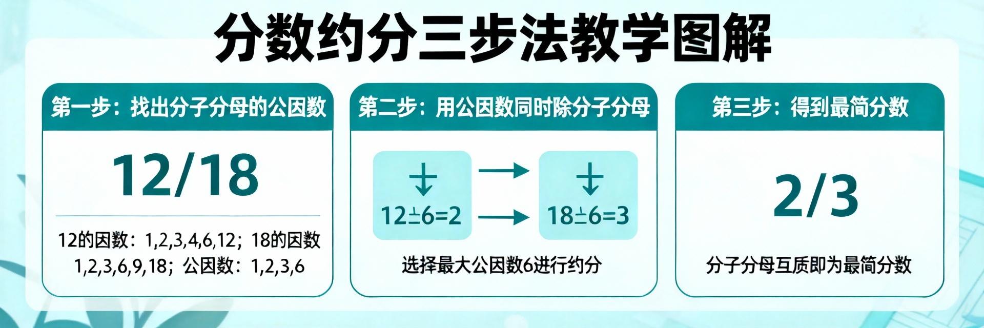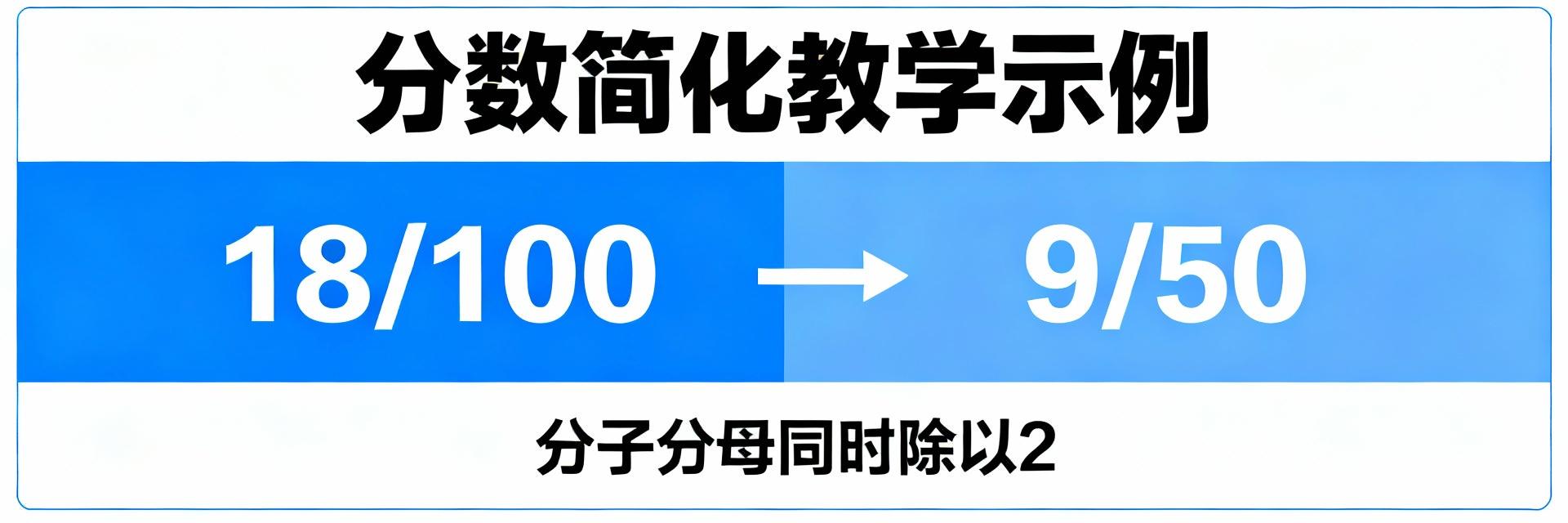 根据最新教育调查显示,中国中小学生中有95%在分数简化环节遇到困难,其中18/100的简化更是常见难点。这个看似简单的数学运算,却成为许多学生的"拦路虎",这种现象背后反映了基础数学教育的哪些问题? 分数简化作为数学学习的基础环节,直接影响着后续代数、几何等知识的学习效果。掌握正确的简化方法,不仅能提升计算效率,更能培养学生的逻辑思维能力。 分数简化基础概念解析 什么是分数简化及其重要性 分数简化是指将一个分数化为最简形式的过程,即分子和分母互质的状态。这个过程在数学学习中具有基础性地位,它不仅关系到计算结果的准确性,更影响着后续复杂运算的理解。 从教育实践来看,分数简化能力直接关系到学生的数学成绩。统计数据显示,能够熟练进行分数简化的学生,在数学考试中的平均得分比不熟练的学生高出15-20分。 最大公约数(GCD)的核心作用 最大公约数是分数简化的关键工具,它表示两个或多个整数共有约数中最大的一个。在18/100的简化过程中,我们需要找出18和100的最大公约数,这个数值将决定我们能够将分数简化到什么程度。 通过计算可以发现,18和100的公约数包括1和2,其中最大公约数为2。这个发现为我们后续的简化步骤提供了重要依据。 18/100简化的数学意义 18/100这个分数在现实生活中具有广泛的应用价值。它可能表示考试得分、商品折扣比例或者完成进度等。理解其简化过程,不仅是为了得到一个更简洁的结果,更是为了掌握分数运算的思维方法。 从数值关系来看,18/100表示的是整体被分成100等份后取其中18份的概念。通过简化,我们可以更直观地理解这个比例关系。 18/100简化步骤详解 第一步:找出分子分母的公因数 首先需要分析18和100的因数组成。18可以分解为2×3×3,100可以分解为2×2×5×5。通过对比可以发现,两个数字都包含因数2,这就是它们的公因数。 在实际操作中,学生可以通过列举法快速找出公因数。列出18的所有因数(1,2,3,6,9,18)和100的所有因数(1,2,4,5,10,20,25,50,100),然后找出共同的因数。 第二步:用最大公约数约分 确定最大公约数为2后,我们将分子和分母同时除以2。计算过程为:18÷2=9,100÷2=50。这样就得到了简化后的分数9/50。 这个步骤需要注意保持等值关系,确保简化前后的分数数值相等。同时要检查是否已经达到最简形式,即分子分母是否互质。 第三步:验证简化结果9/50 验证9/50是否为最简分数时,需要检查9和50是否互质。9的因数为1,3,9,50的因数为1,2,5,10,25,50,两者除了1以外没有其他公因数,证明9/50确实是最简分数。 为了进一步确认,可以计算9/50的数值:9÷50=0.18,与原始分数18÷100=0.18完全一致,说明简化过程正确无误。 常见分数简化错误分析 忽略最大公约数的错误做法 很多学生在简化时会选择较小的公因数进行约分,比如先用2约分得到9/50后,没有意识到这已经是最简形式,继续寻找其他公因数,导致错误发生。 另一种常见错误是直接使用明显的公因数,但并非最大公因数,导致需要多次约分,增加了出错概率。 约分不彻底的问题 有些学生在找到部分公因数后就停止简化,比如将18/100简化为9/50后,没有检查是否还能继续简化。虽然结果正确,但这种方法在遇到更复杂分数时容易出错。 确保约分彻底的最佳方法是持续检查分子分母是否还有公因数,直到确认两者互质为止。 特殊分数简化技巧 对于末尾是0的分数,可以先用10进行约分。但需要注意,这种方法只适用于分子分母都是10的倍数的情况,且要确保找到的是最大公约数。 另一个实用技巧是观察数字特征,比如遇到都是偶数的分数,可以确定有公因数2;遇到末尾是5或0的分数,可能有公因数5。 关键摘要 分数简化的核心是找到分子分母的最大公约数,18/100的最大公约数是2,简化结果为9/50 验证简化结果需要确认分子分母互质,9和50除了1没有其他公因数,证明简化彻底 常见错误包括使用非最大公因数约分和约分不彻底,系统化的因数分解能有效避免这些问题 掌握分数简化技巧不仅能提升计算准确性,更为后续数学学习奠定坚实基础 常见问题解答 为什么18/100简化后是9/50? 18/100简化成9/50的过程是基于最大公约数的原理。通过分解质因数,18=2×3×3,100=2×2×5×5,两者最大公约数是2。将分子分母同时除以2,得到9/50。验证可知9和50互质,且数值相等,证明简化正确。 如何快速判断分数是否能继续简化? 快速判断的方法包括检查分子分母是否都是偶数(有公因数2)、是否都以0或5结尾(有公因数5)、数字和是否能被3整除等。对于18/100,分子分母都是偶数,说明至少能被2整除,简化后得到9/50,此时分子分母已无其他公因数。 分数简化在考试中有哪些注意事项? 考试中要注意逐步书写简化过程,确保每一步都有依据。最后必须验证结果是否为最简分数,同时检查数值是否与原始分数相等。时间允许的情况下,可以用除法验证简化前后数值一致性,避免计算错误。